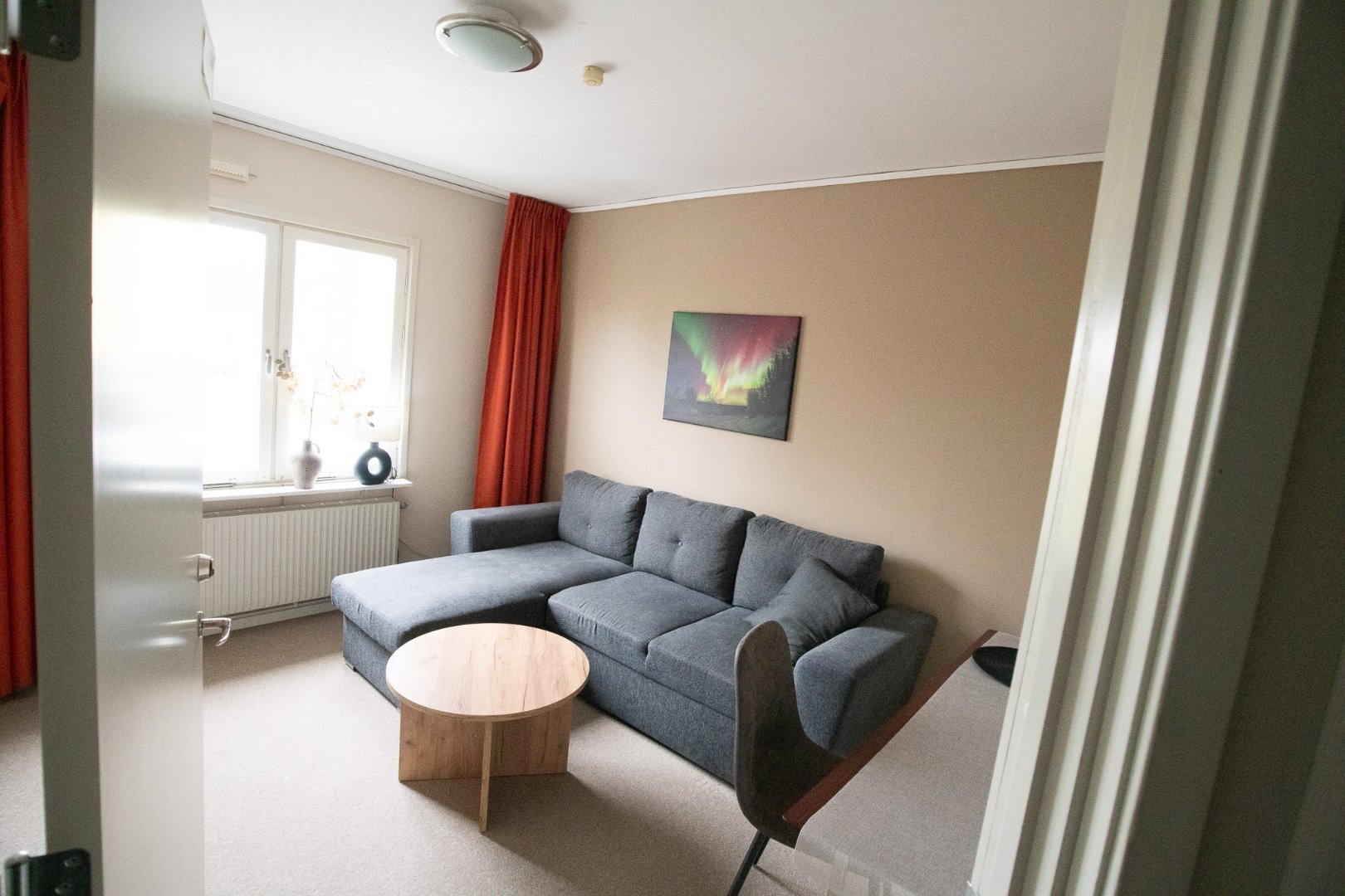 Vår bekväma 2-rumslägenhet erbjuder gott om utrymme, vilket gör den perfekt för både korta och långa vistelser. Det separata sovrummet har en mysig enkelsäng, medan vardagsrummet har en bekväm sovsoffa och en platt-TV för avkoppling. En särskild arbetsyta erbjuder ett praktiskt område för arbete eller studier. Lägenheten har också ett modernt badrum med dusch samt en kaffe- och tekokare för din bekvämlighet. Som gäst har du fri tillgång till det fullt utrustade gemensamma köket på 4:e våningen. Njut av en rymlig och väldesignad vistelse med allt som behövs för komfort och flexibilitet.